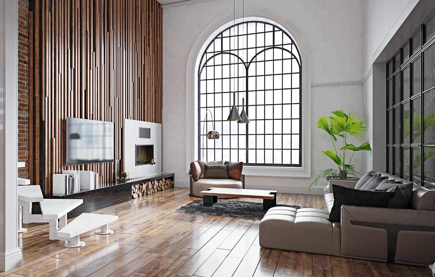 Vor allem bei sehr hohen Räumen bietet es sich an, die Decke in einem wärmeren Ton zu gestalten. Hierdurch entsteht ein gemütlicherer Eindruck, die Akustik verändert sich und die Beleuchtung wird durch Echtholzpaneele besser in Szene gesetzt.